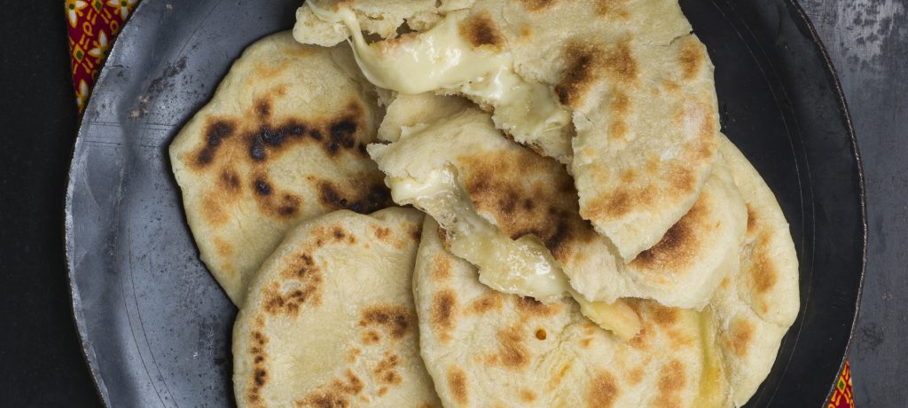 Aplatir les morceaux de pâte en petites galettes, inclure un morceau de fromage au centre et replier en faisant une boule pour enfermer le fromage, faire de même avec le reste de pâte et de fromage ;