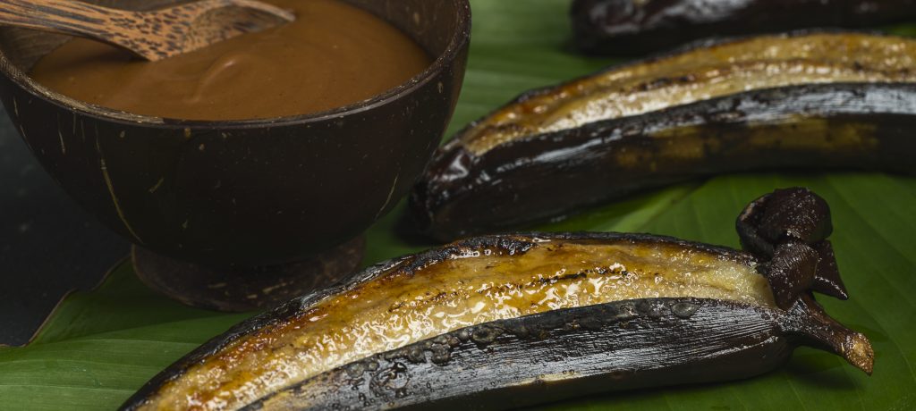 Suggestion : on peut caraméliser la chair des bananes, une fois sortie du four, à l’aide d’un chalumeau et avec un peu de sucre